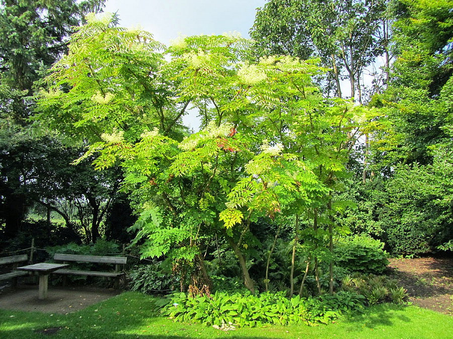 Саженцы Аралии высокой (Aralia elata) – быстрорастущее лиственное дерево или кустарник высотой до 3 м. Форма кроны и крупная сложно-перистая листва напоминает тропические культуры. Поэтому растение интересно и необычно смотрится в любых древесных композициях, а также как самостоятельное украшение садов и парковых зон. Окраска листвы Aralia elata зеленая. В период цветения, которое приходится на июнь, дерево покрывается соцветиями мелких белых цветов со слабым приятным ароматом. В первые 5-6 лет после посадки культура не цветет. Ветвистая система развивается только при повреждениях ствола. Чаще аралия высокая растет прямо.