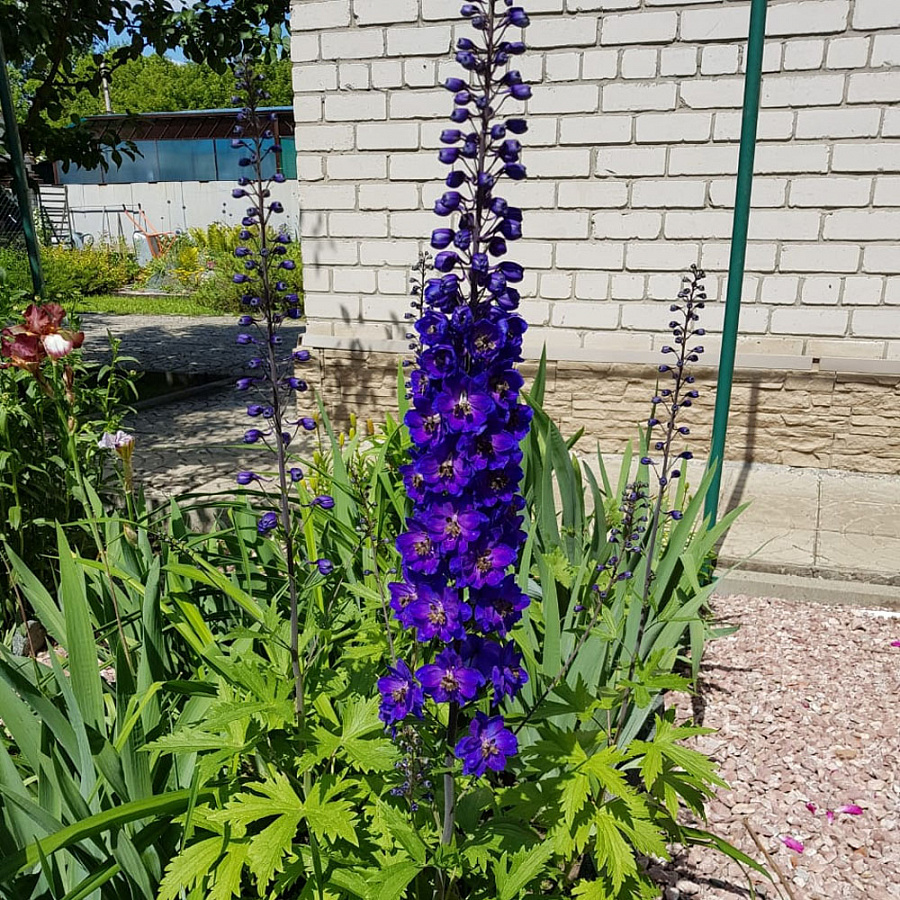 Дельфиниум культурный черный рыцарь - это великолепное растение с фиолетово-синими цветками, которое поражает своей изящностью и красотой. Сорт chernyy-rytsar отличается высотой до 180 см, что делает его настоящим королем сада. Его ствол прочный и прямой, листья формы ланцета создают элегантный контраст с яркими цветками.