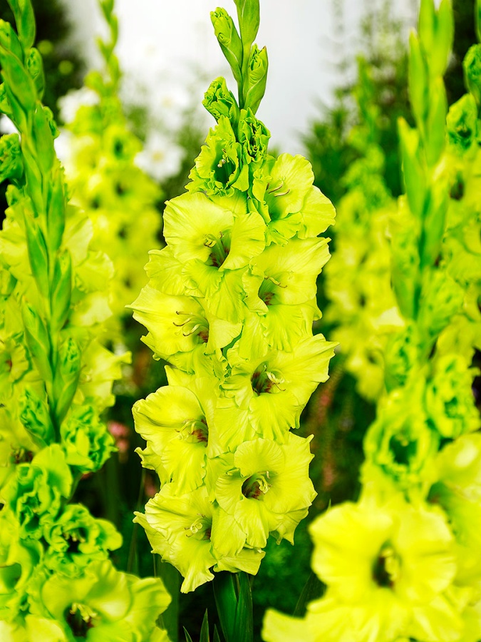 Гладиолус крупноцветковый эвергрин - это великолепное растение с зелено-желтыми цветками, которое поражает своей красотой и изяществом. Высота этого гладиолуса может достигать 80-110 см, а размер цветка радует глаз своими 8-12 см. Это растение отличается многолетним цветением в июле, августе и сентябре, радуя вас своими яркими цветами. Гладиолус крупноцветковый эвергрин предпочитает солнечные участки с дренированными богатыми почвами, но также может расти в полутени.
