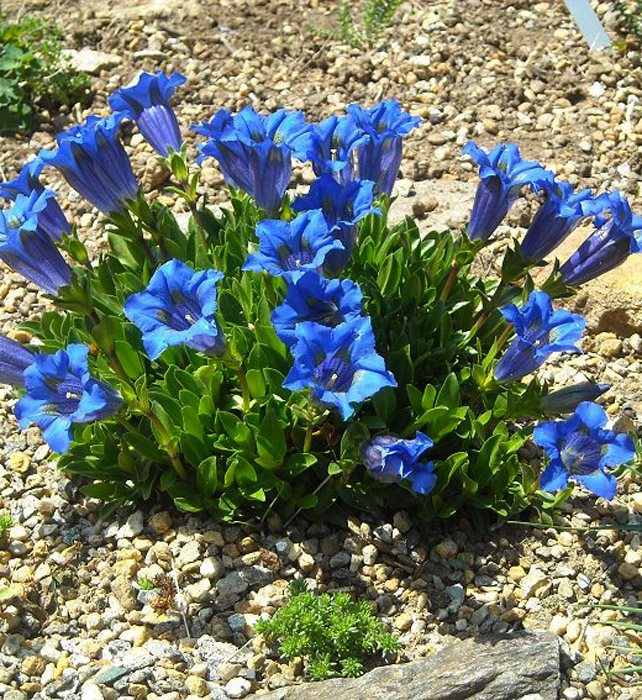 Бесстебельная горечавка прекрасно подходит для оформления каменистых горок, подпорных стен и альпинариев. Этот декоративный сорт очень любит хорошее освещение, поэтому не стоит размещать его в тени.