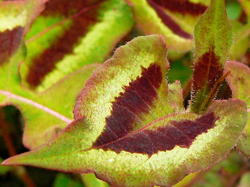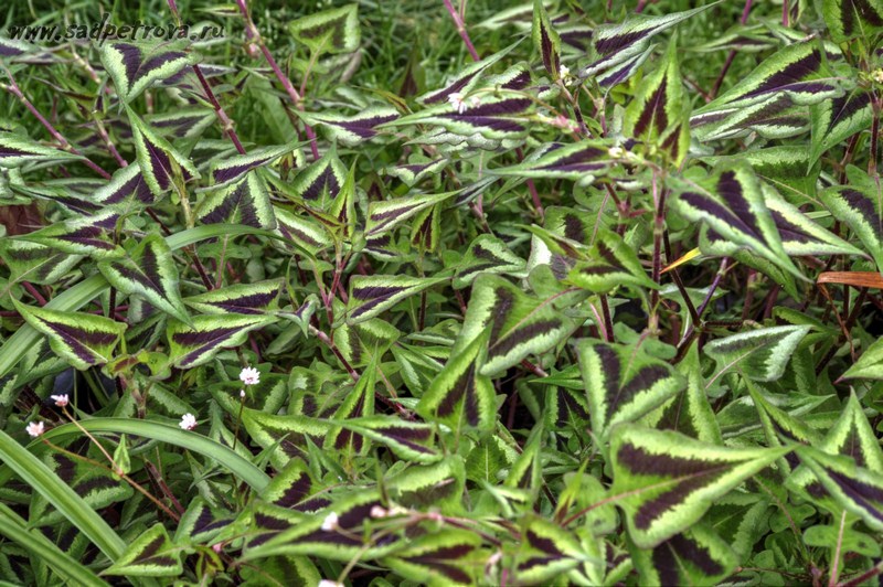 Саженцы горца мелкоголового Пёпл Фэнтэзи (Persicaria micrantha Purple Fantasy), благодаря яркой раскраске листьев, могут выполнять функцию акцента в цветочной композиции. Яркие зеленые листья по центру украшены пурпурно-сливовым треугольником, обрамленным нежно-зеленым кантом. Листочек кажется бархатным из-за множества ворсинок бордового цвета. Цветет растение с середины лета, но цветы особо не отражаются на его декоративных качествах – меленькие розово-белые цветы теряются на фоне яркой листвы. В высоту растение достигает 50-60 сантиметров. Наиболее яркой окраски горец достигает при посадке на солнечных участках, возможна легкая полутень.