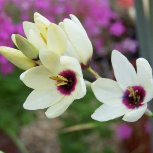Луковицы иксии гибридной Хогарт (Ixia hybrid Hogarth) помогают создать пышную клубную посадку, в сочетании с другими растениями и в одиночных композициях. Высота иксии не превышает 50 сантиметров. Листья линейные, остроконечные. Цветки воронковидные, небольшие – 2-4,5 сантиметра в диаметре. Окраска – кремово-белая, кончики каждого лепестка – нежно-сиреневые, основание – пурпурно-рубиновое. Цветение длится около 1 месяца, после срезки, сохраняется в букете 1,5-2 недели. Иксия хорошо растет и обильно цветет на солнечных местах, не любит ветра. В период роста и цветения нуждается в обильном поливе. На зиму луковица выкапывается.