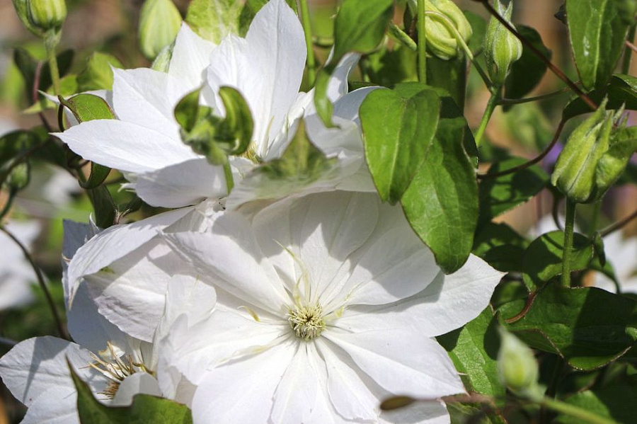 Саженцы клематиса гибридного Дансинг Дорин (Dancing Dorien) предпочитают хорошо освещенные, защищённые от ветра и сквозняков места. Для выращивания подходит плодородная супесчаная или суглинистая рыхлая почва. Цветет в июне и повторно в августе. Цветки белые, полумахровые диаметром 6-8 см. Высота растения достигает 200 см, для полноценного развития саженцам нужна опора. Клематис гибридный Дансинг Дорин (Dancing Dorien) высаживают рядом с ограждениями, беседками, решётками и другими садовыми опорами. Подходит как для групповых, так и для одиночных посадок.