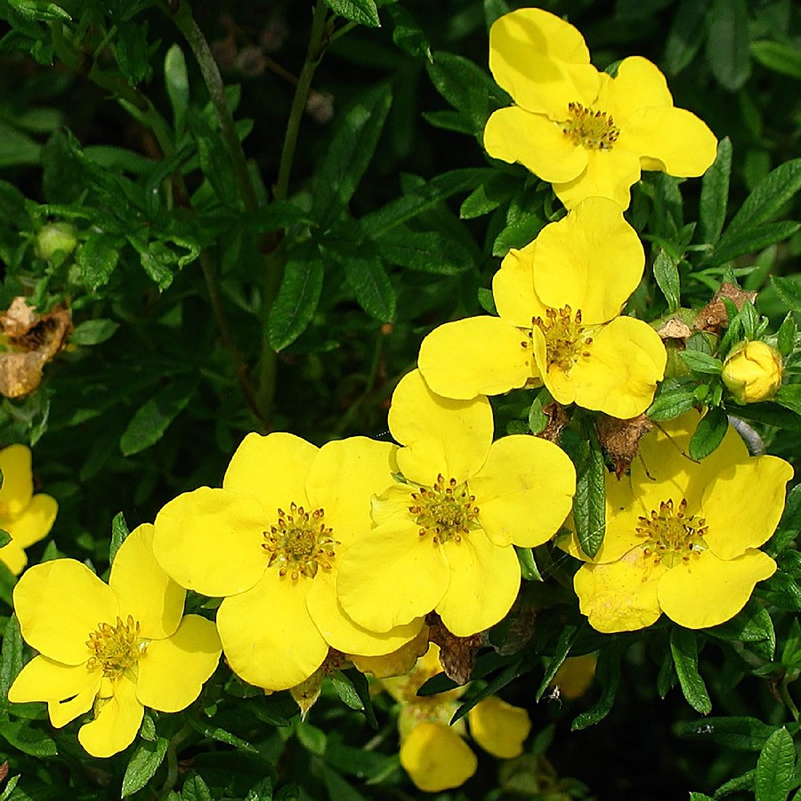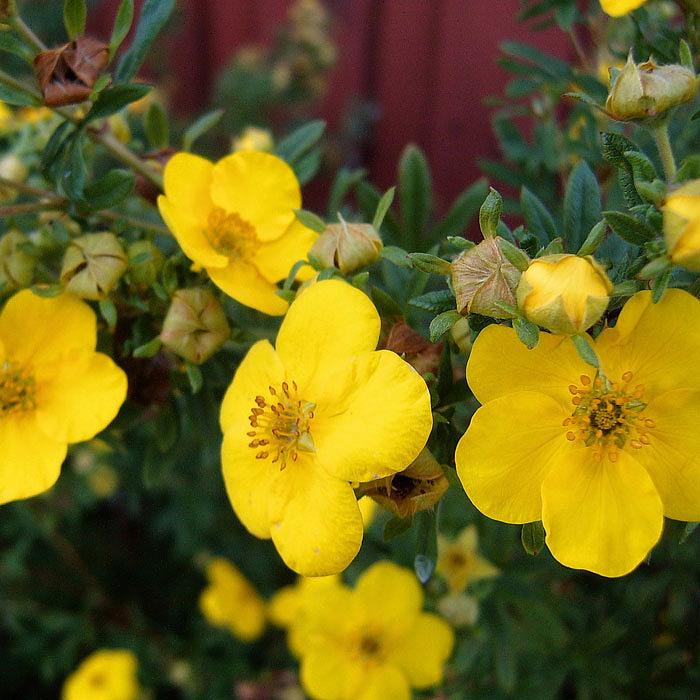 Саженцы лапчатки кустарниковой Голдфингер (Goldfinger) помогут организовать крупный куст с очень большими цветками ярко-желтого цвета, которые создают прекрасный контраст с темно-зеленой листвой. Цветет этот сорт с июня и до самых заморозков. Отлично переносит зиму и имеет повышенную устойчивость к мучнистой росе.