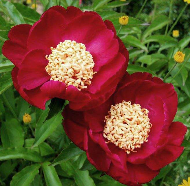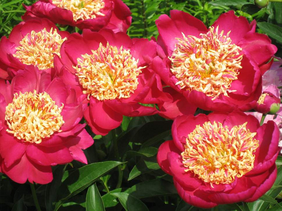 Саженцы пионов Сворд Денс (Sword Dance) - это эффектный сорт с цветками броской окраски. Период цветения приходится на июнь, июль. Цвет карминно-красный. Они состоят из 5-12 лепестков. Лепестки широкие, блестящие, расположены в 1 ряд. На ярком солнце выгорают. Поэтому высаживать саженцы пионов Сворд Денс стоит в частично затененные места. Цветоносы прямостоячие, тонкие, но прочные. Высота кустарника достигает 70-90 см. Куст компактный, не разваливается. Универсальный срезочный сорт, который также подходит для оформления различных цветников и бордюров.